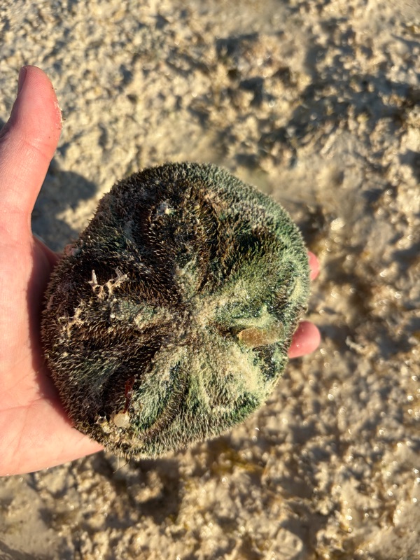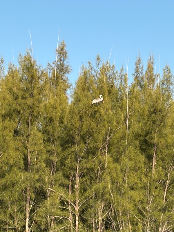 When we got back to the house, I walked across the street to the beach. It was low tide. I took a lengthy walk. I found a sand dollar creature. I also watched this pelican fly around looking for a fish dinner. He awkwardly landed in an evergreen tree.