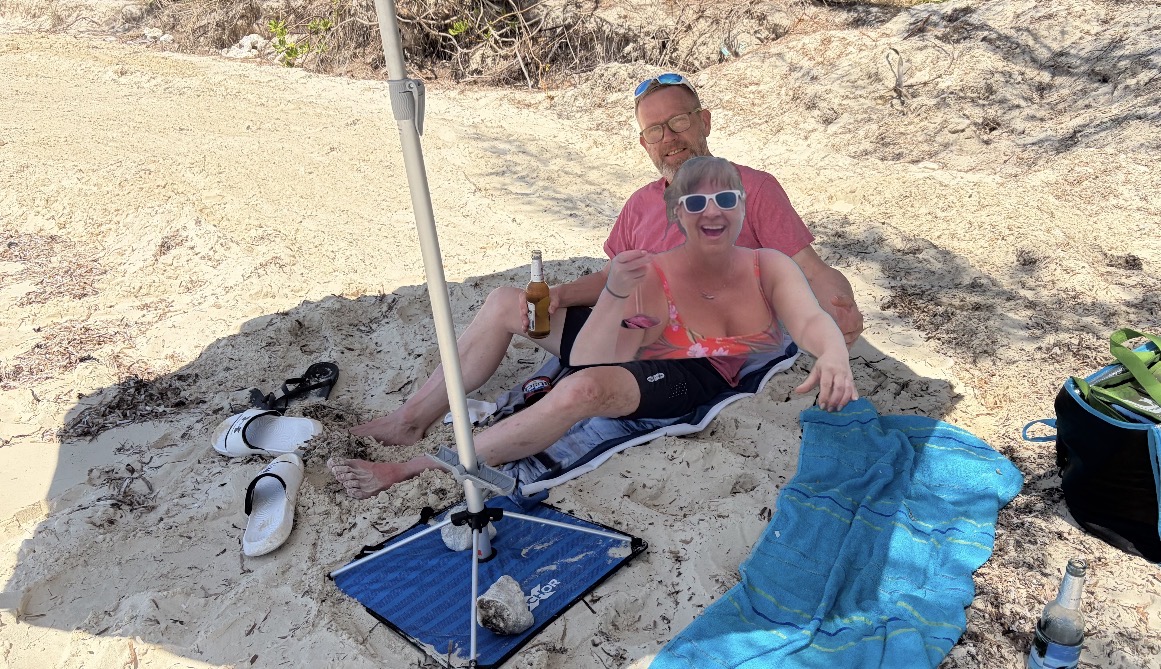 We had an umbrella we were sitting under. We were watching a couple farther down the beach try to put together an “easy up”. It clearly was not easy for them. The lady had on a thong bathing suit and kept bending over. She may have a painful sunburn on her balloon knot tomorrow. The bathing suit was barely legal.