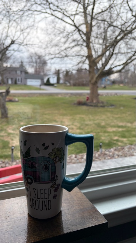 No coffee on the beach today, sad face. My coffee was overlooking the squishy yard and trees with no leaves.