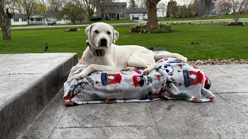 Moe spent the entire day outside. Half of the day he sat guarding the house like a statue. Then Paul brought his bed out. Moe proceeded to continue guarding the house by looking at the backs of his eyelids and snoring.