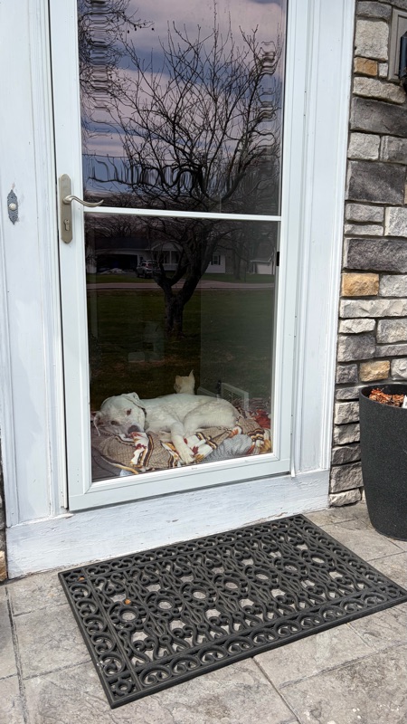 Moe wanted to be outside today. I opened the door and moved his bed so he could be nosy and not bite anyone. He sleepily guarded the house. You can see little Jiminy right by his side. He was not guarding the house at all. Ha!