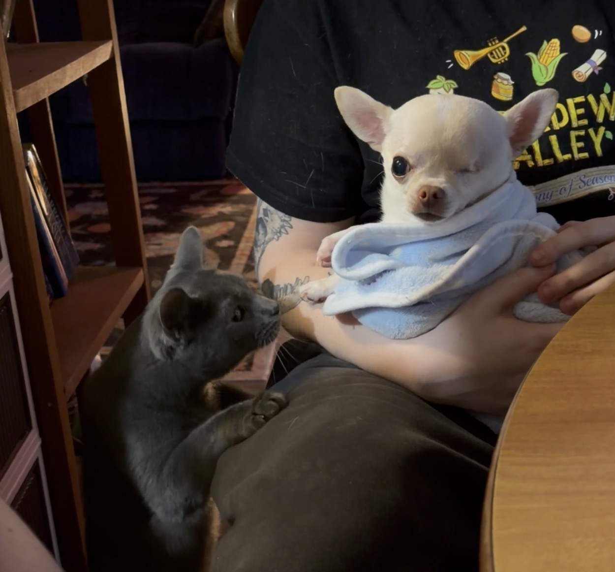 Avery’s cat Pluto, was so curious of Jiminy’s. He was almost stalking him.